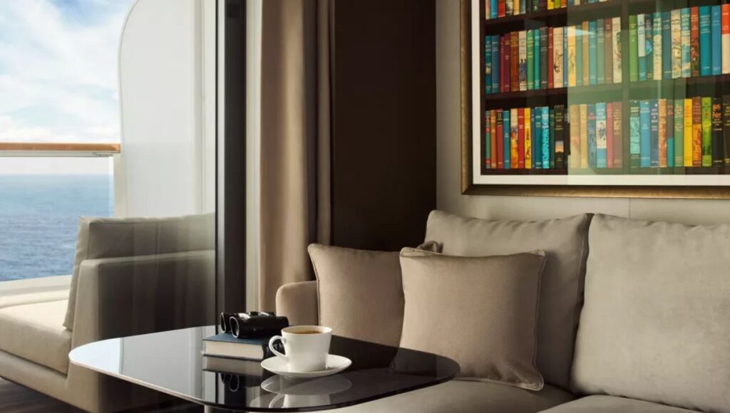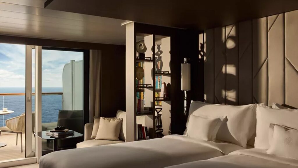 The layout feels calm and thoughtfully designed. Rather than a traditional cruise cabin, the space feels closer to a stylish apartment overlooking the ocean.