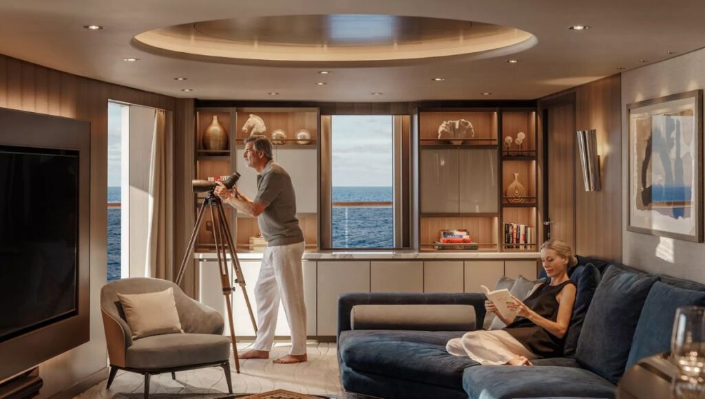 The suite also includes a spacious walk in wardrobe, a seated vanity area, heated bathroom floors, wireless bedside charging, and binoculars for wildlife spotting while at sea.