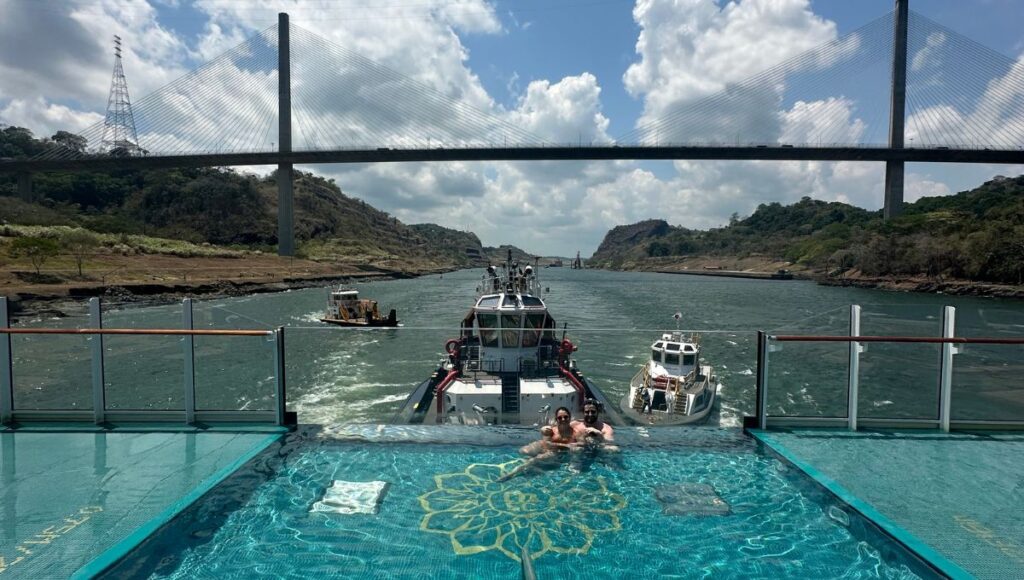 One of the most memorable moments of the voyage came during the Panama Canal transit. Relaxing in the infinity pool with an Aperol Spritz while watching the Miraflores Locks open beside the ship was, in Patrick’s words, an unforgettable travel experience.