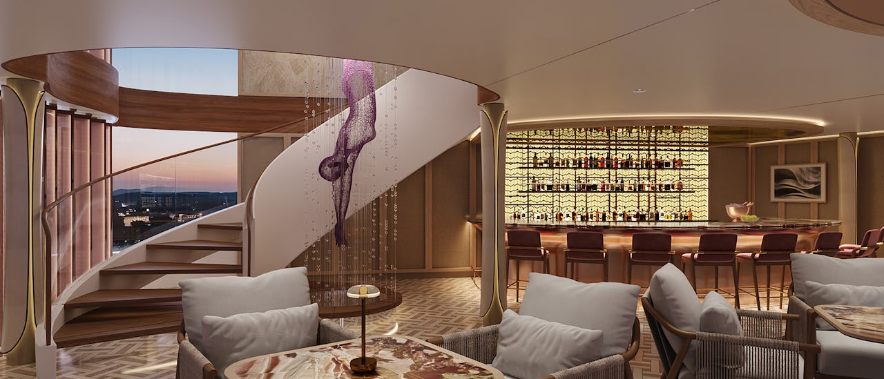 Enjoy the Sunset Lounge, a chic open-air spot with a glass-sided plunge pool, seating, its own bar, and access via stairs to the aft Sundeck’s Sunset Park.