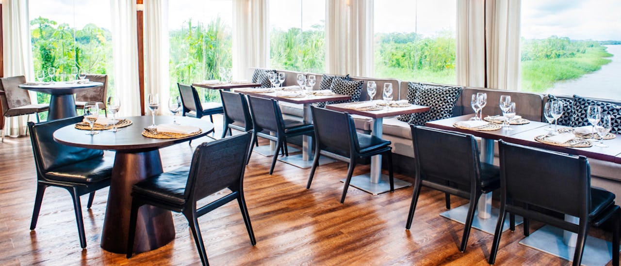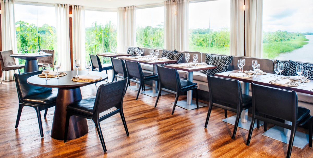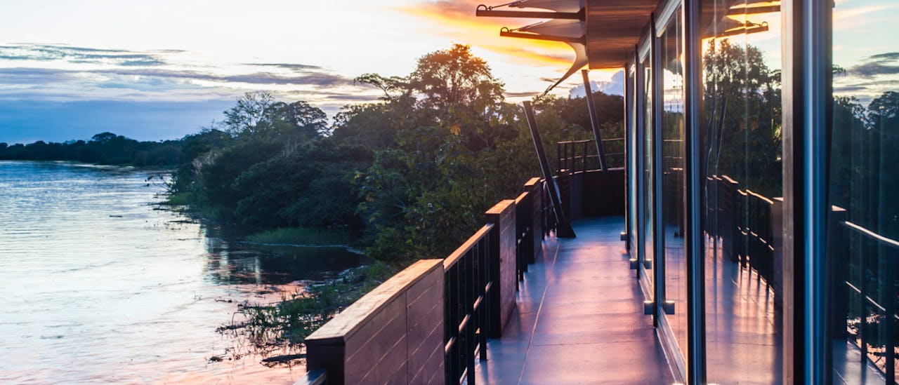 On board, 16 spacious suites with floor-to-ceiling windows give guests a full view of the Amazon’s river and rainforests